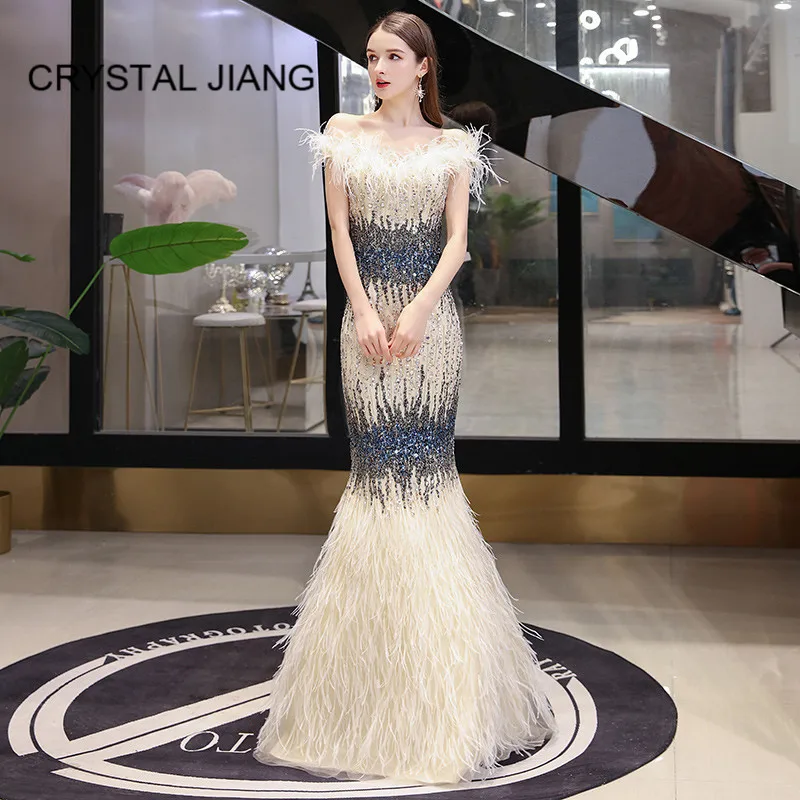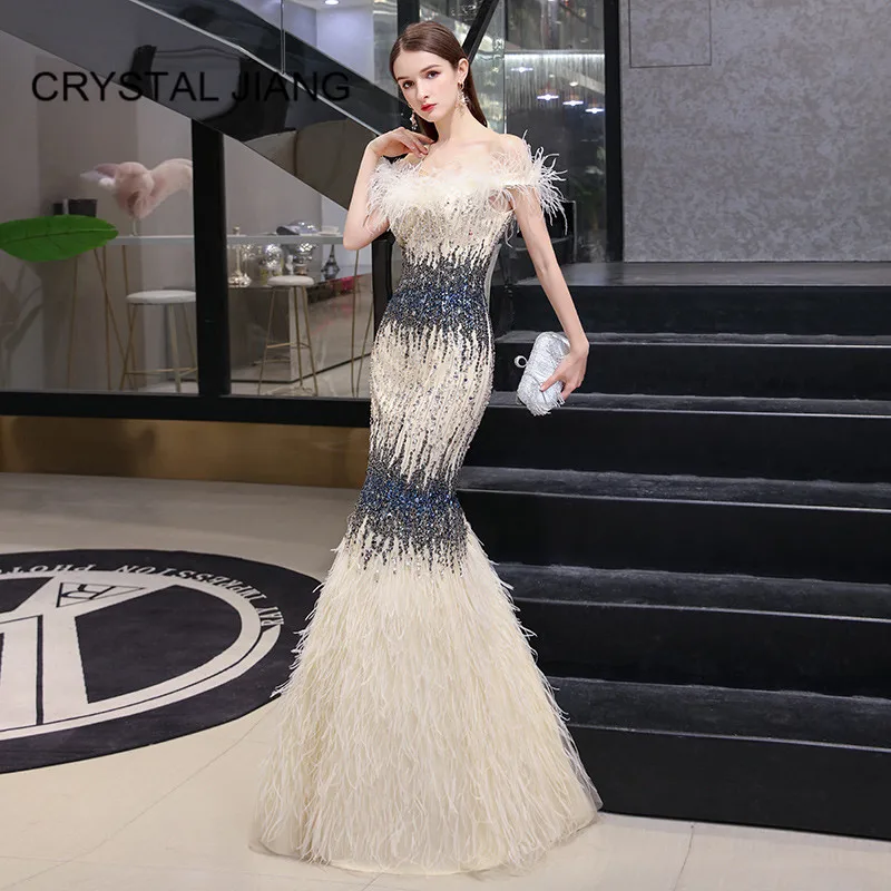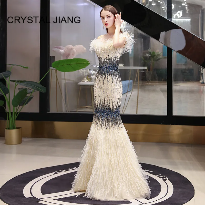 Special Offer Nieuwe Collectie 2020 Luxe Avondjurk Crystal Kralen Champagne Voering Formele Gown Feather Mermaid Avondjurken Lange Discount 20% Today!