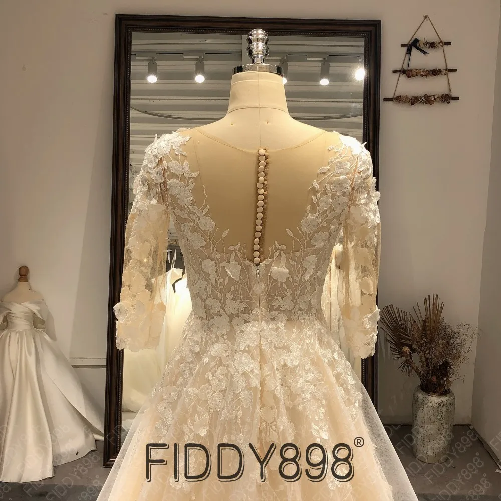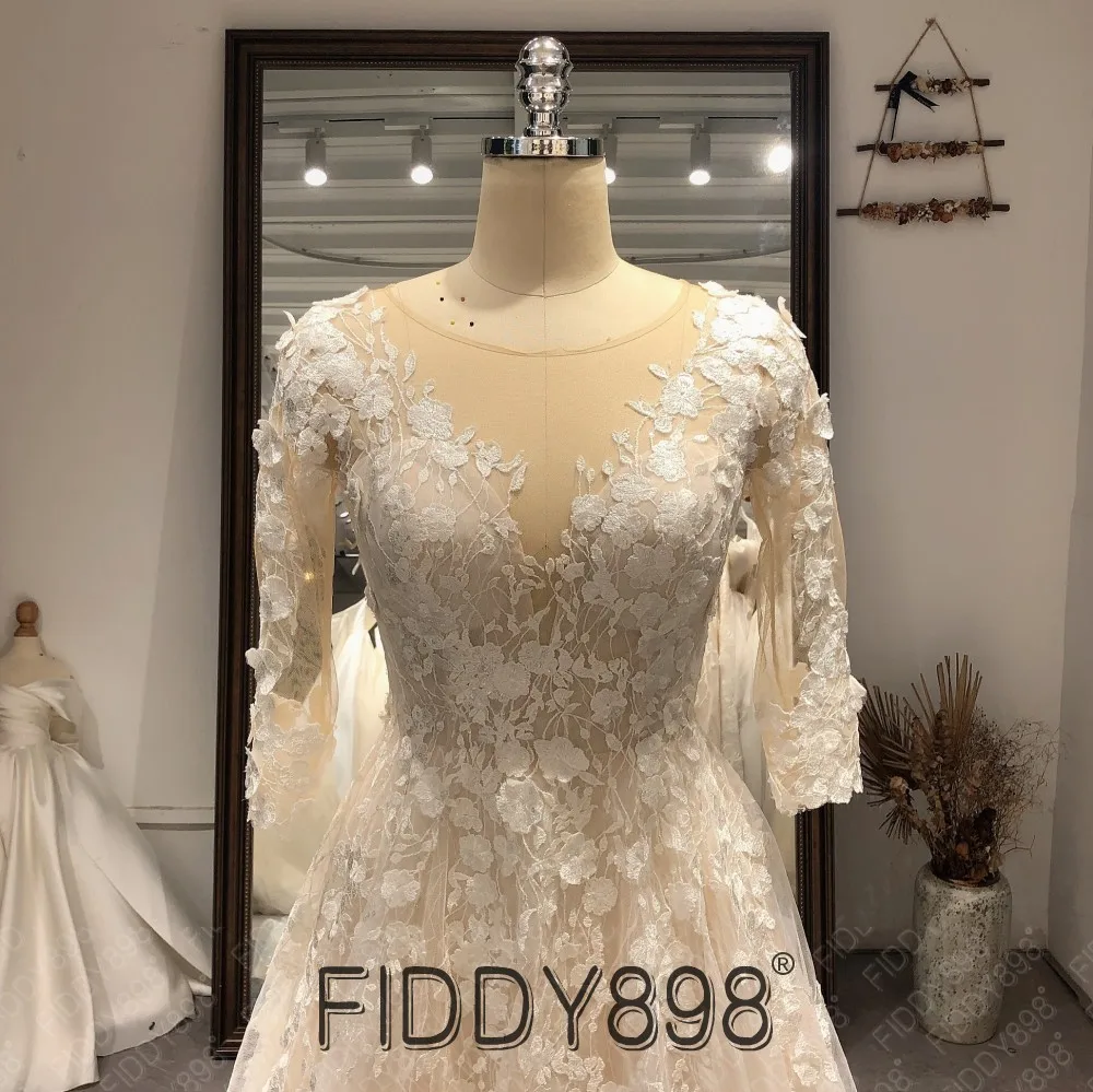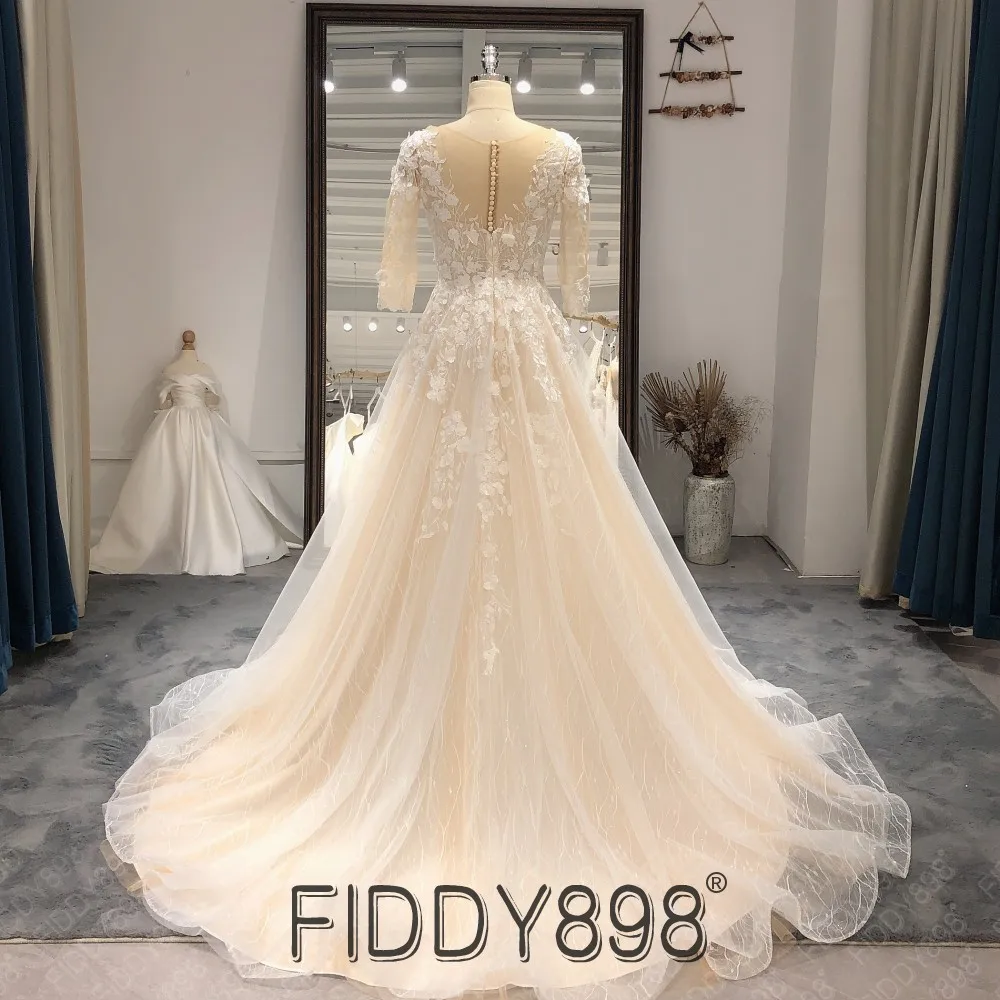 Product Name: Light Champagne Wedding Dresss 2021 Nieuwe Custom-Made A-lijn Hals 3/4 Mouwen Bruid Dress Applicaties Kant Bruidsjurken Tulle