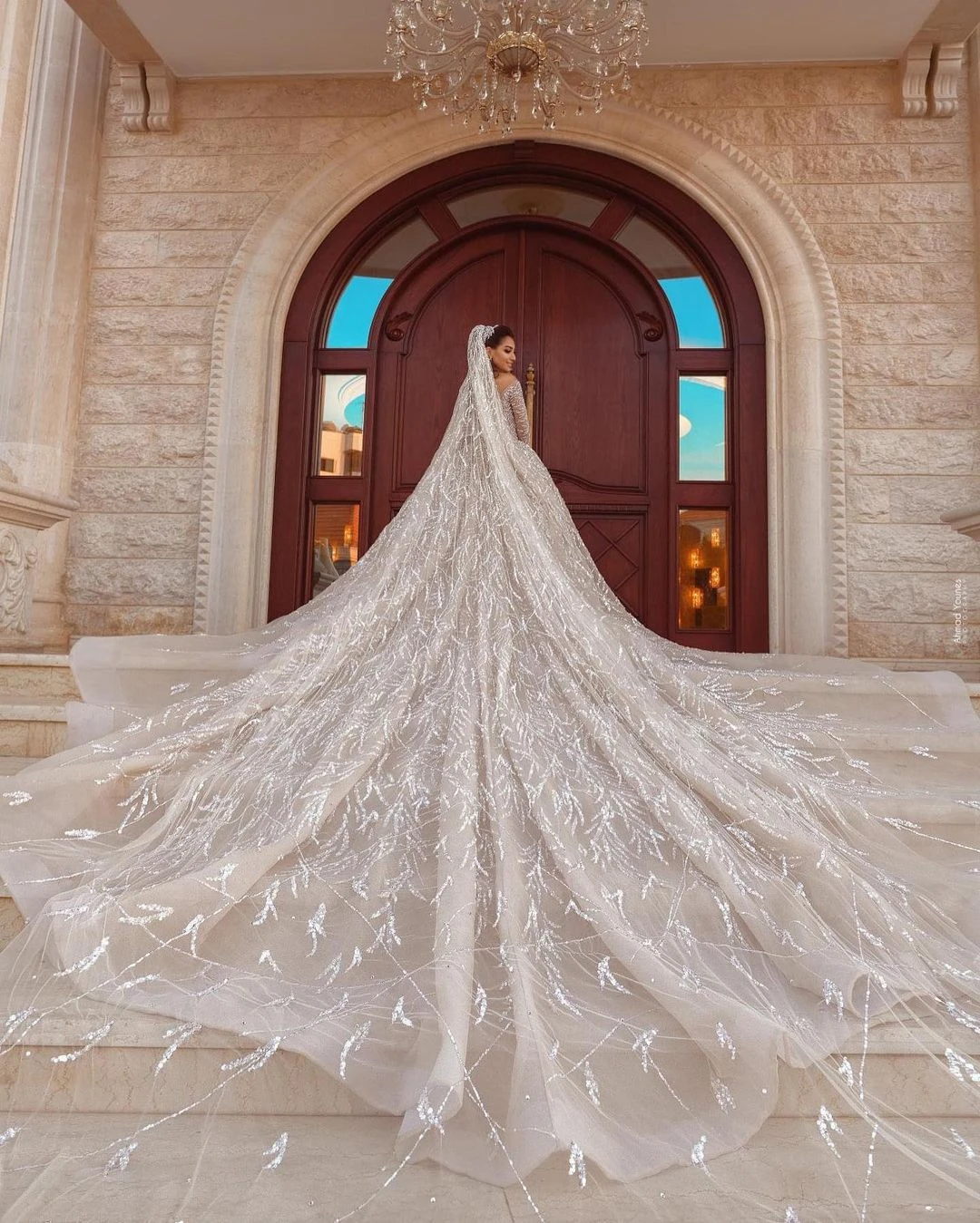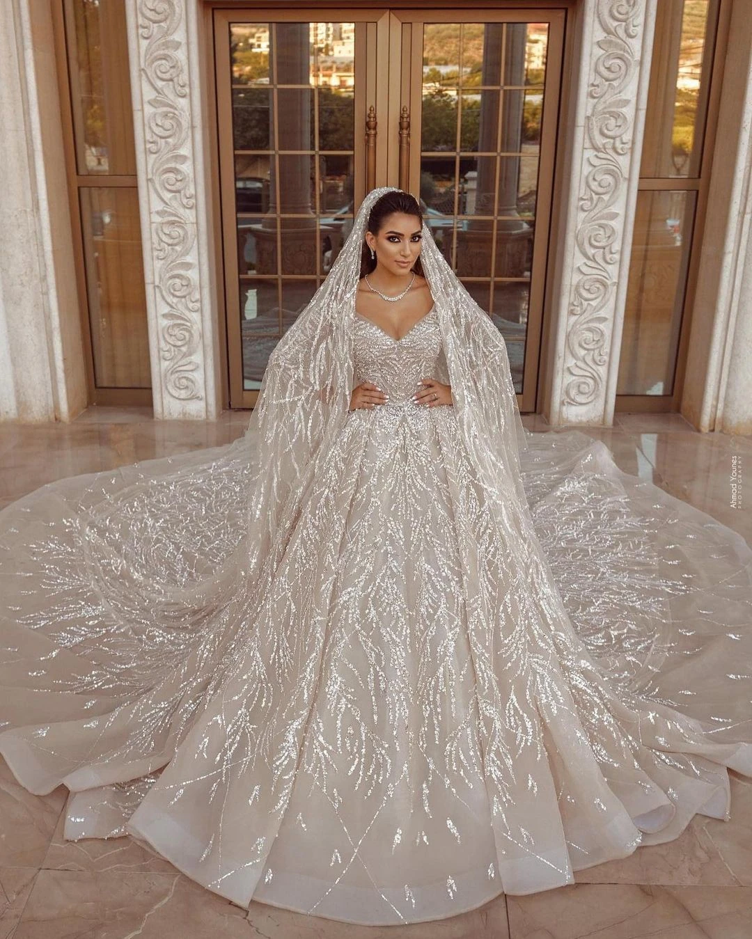 Product Name: Luxe Arabisch Champagne Trouwjurken Baljurk Lange Mouwen Pailletten Kralen Bruids Bruidsjurken Met Lange Trein Платье