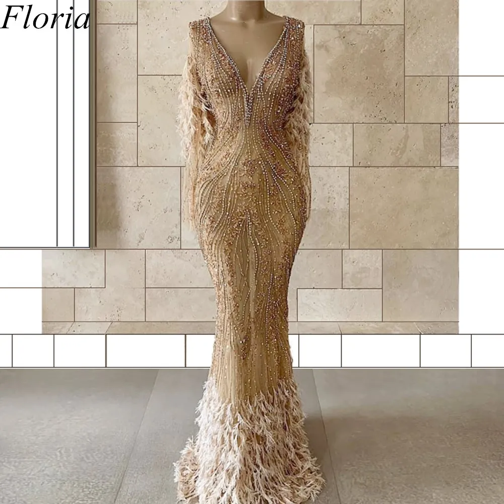 Product Name: Plus Size Champagne Formele Avondjurken 2019 Kralen Illusion Party Dress Lange Mermaid Vrouwen Partij Jassen Veer Abendkleider