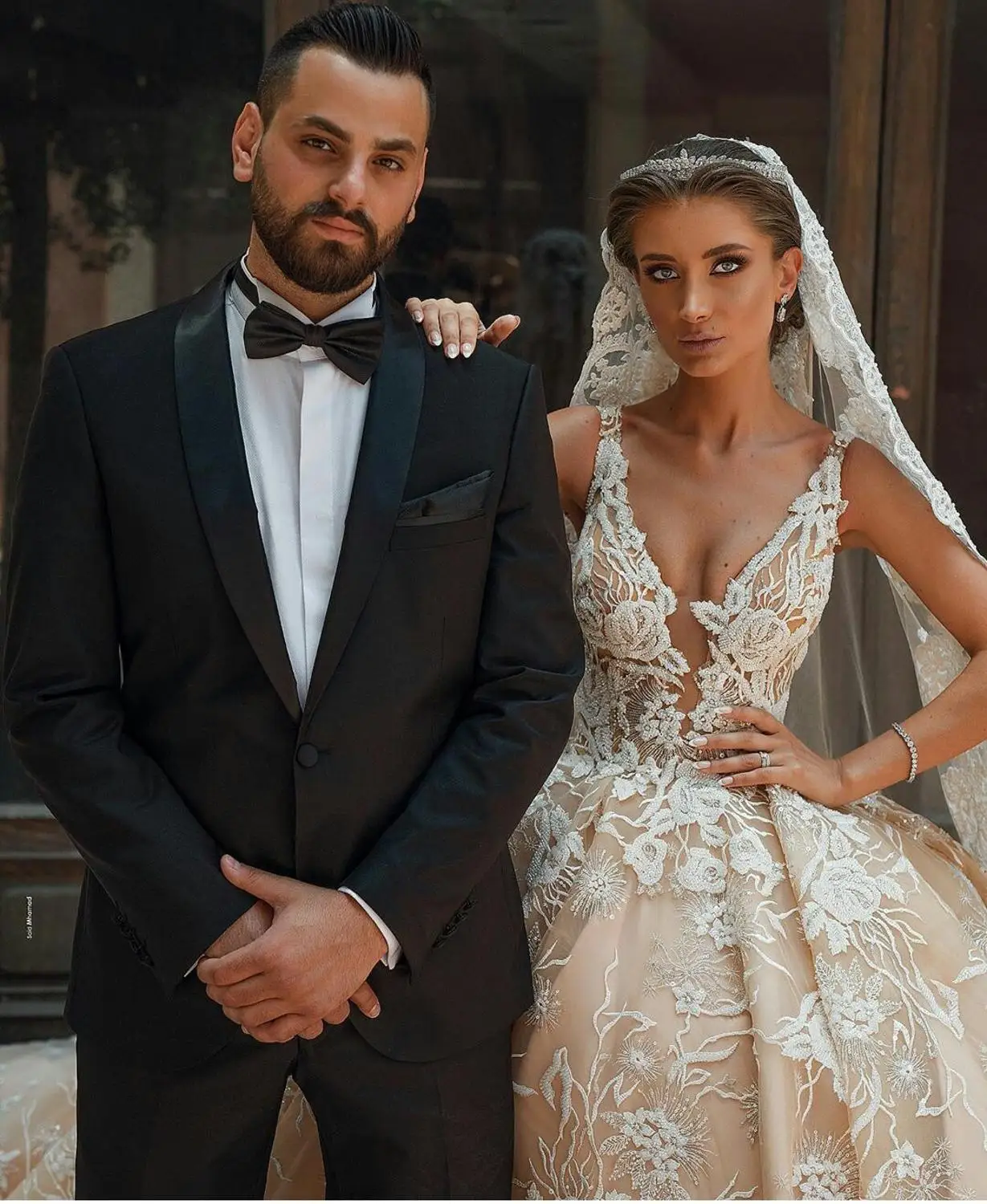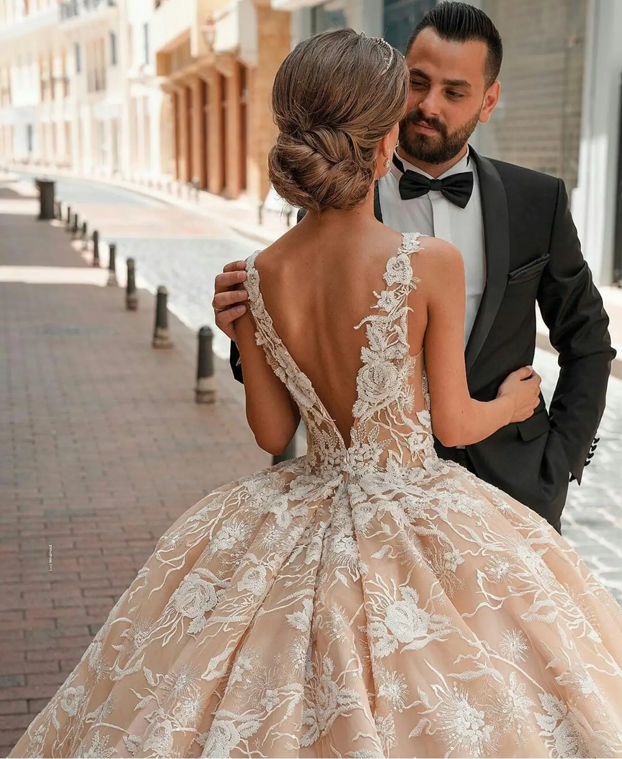 Product Name: Luxe Kathedraal Lengte Trouwjurken Champagne Kant Geappliceerd Diepe V-hals Bruidsjurken Plus Size 2021 Vestido De Novia