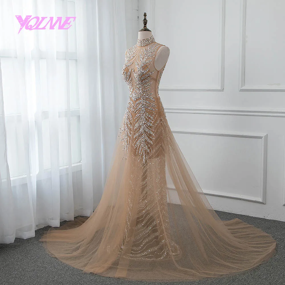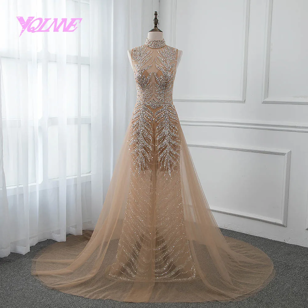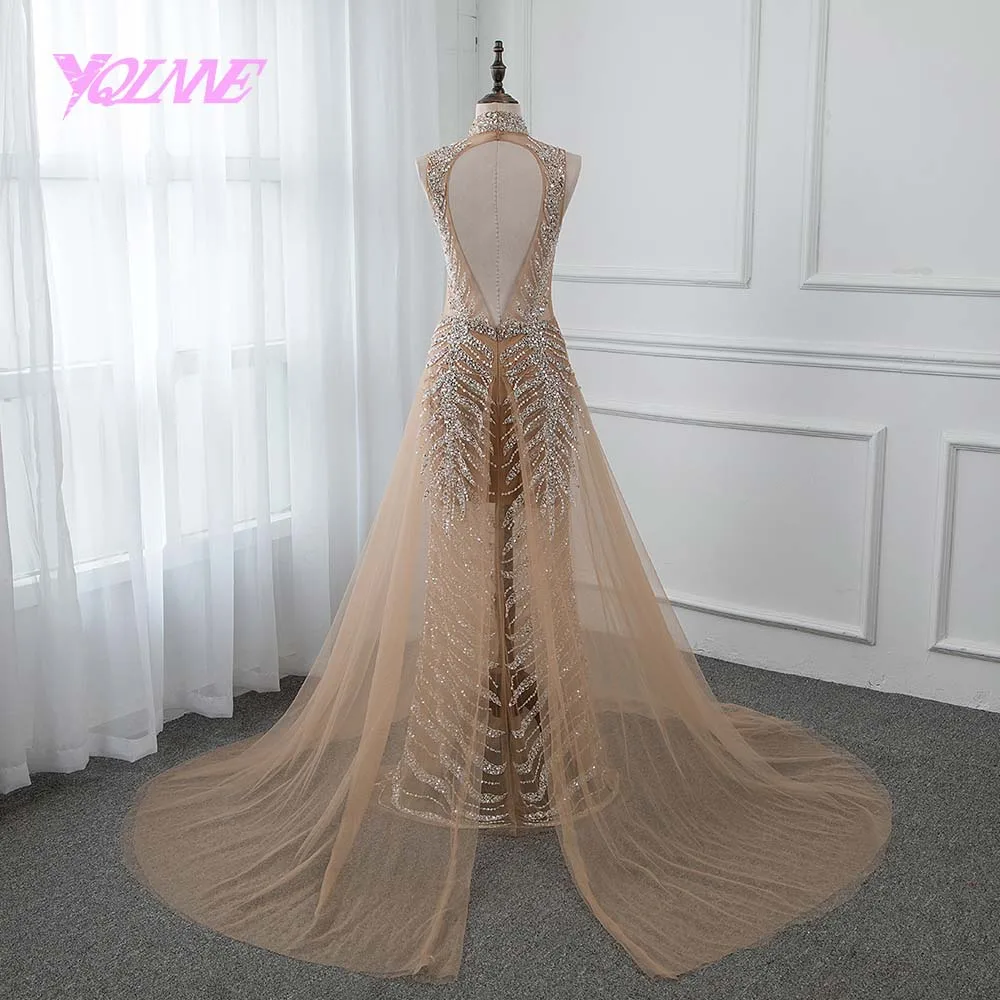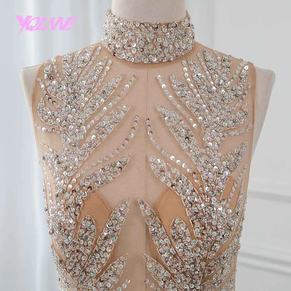 Special Offer YQLNNE 2019 Champagne Strass Avondjurk Lange Hoge Hals Backless Prom Gown Robe De Soiree Pageant Jurken Discount 0% Today!
