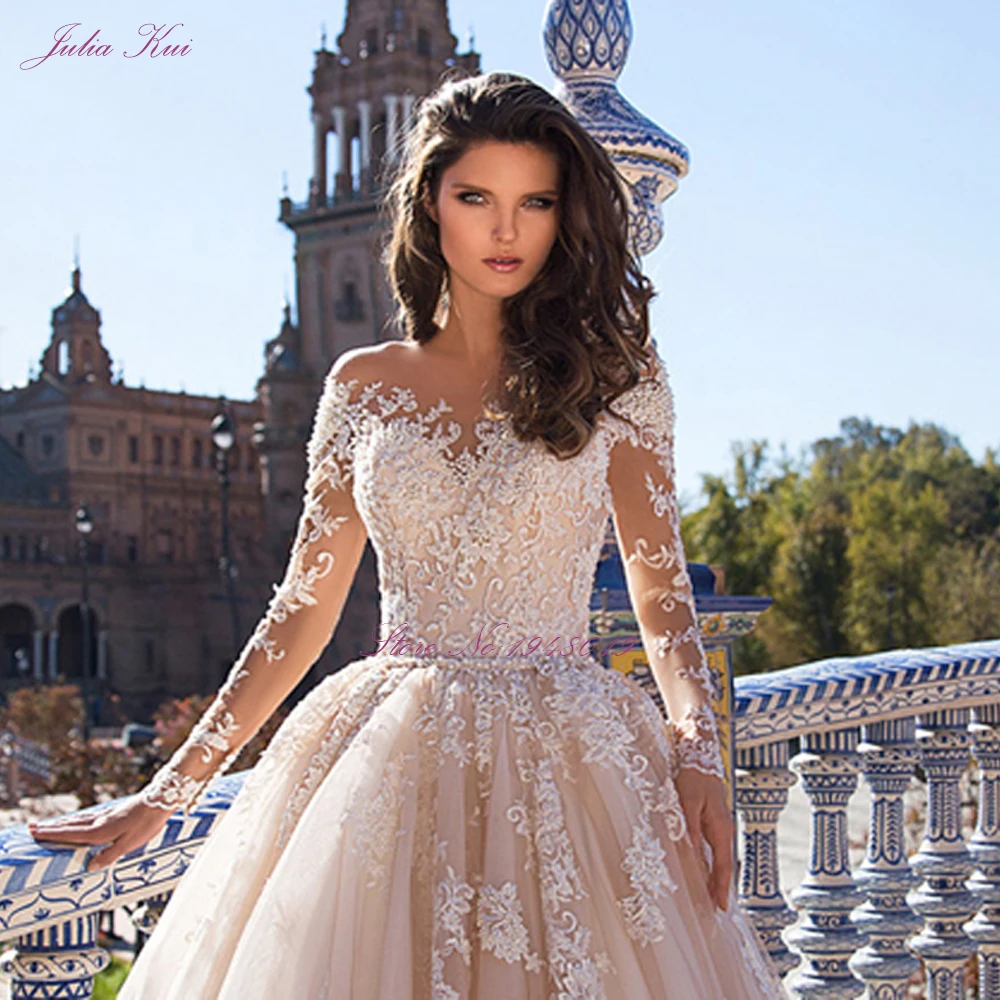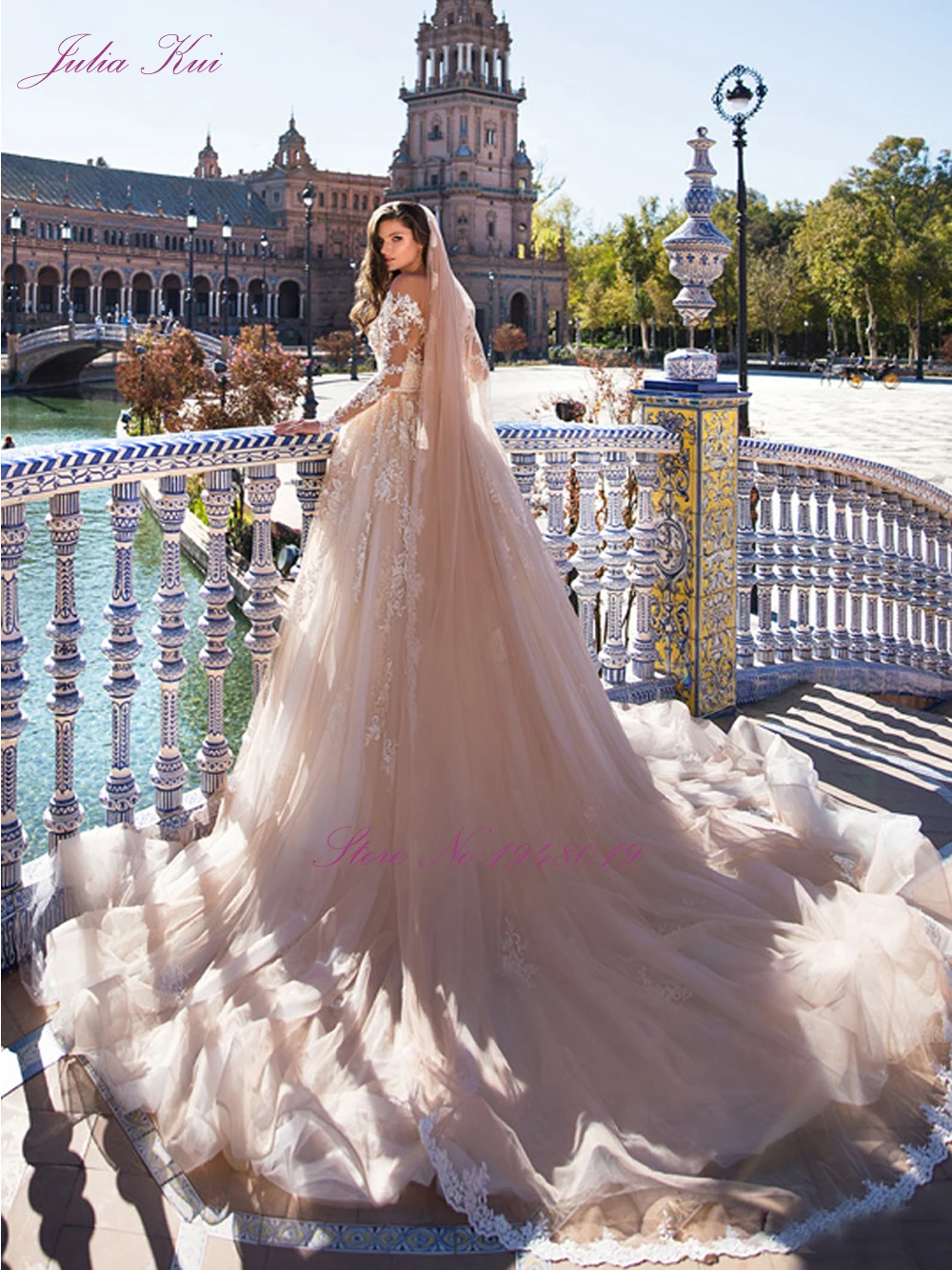 Special Offer Julia Kui Luxe A-lijn Trouwjurk Champagne Kleur Met Scoop Hals Van Kapel Trein Lange Mouwen Discount 35% Today!