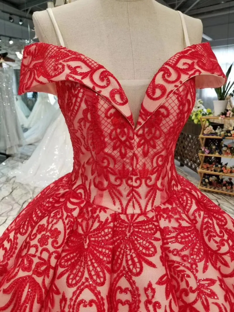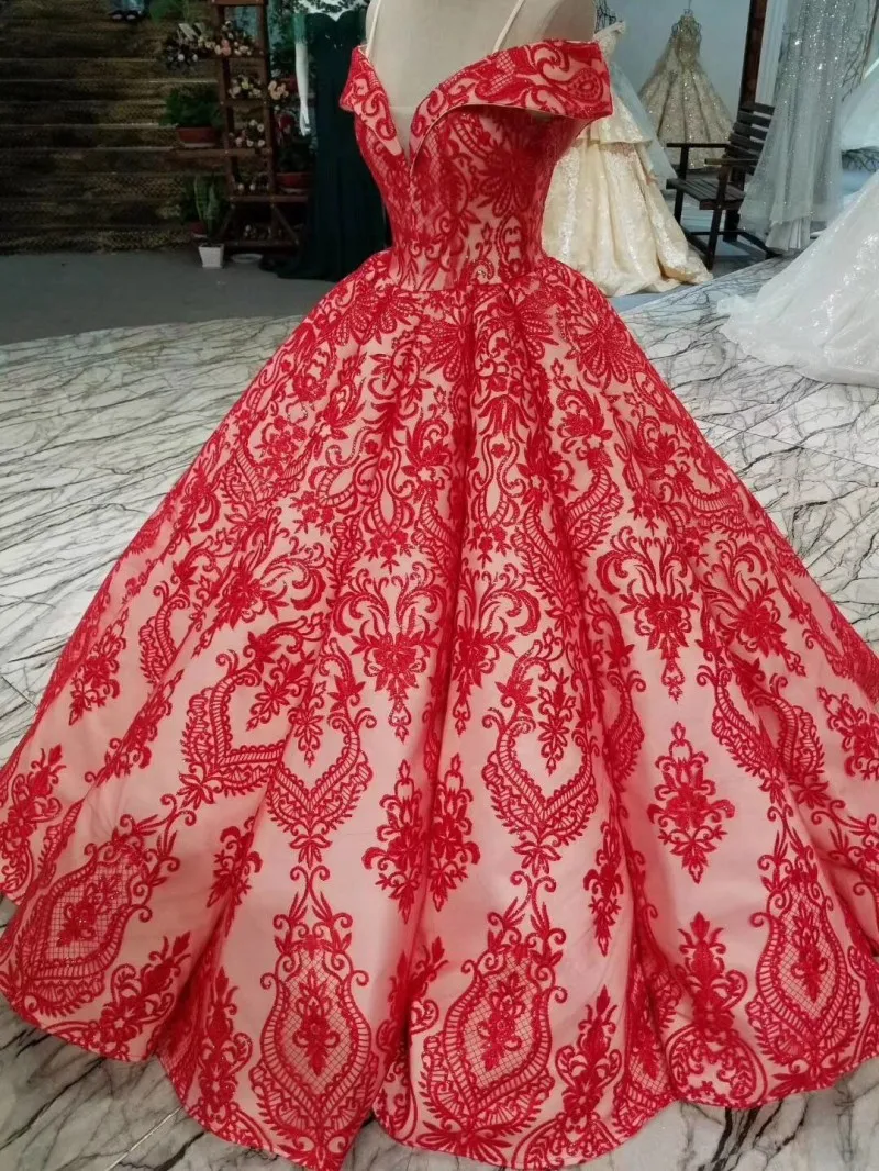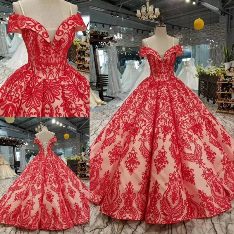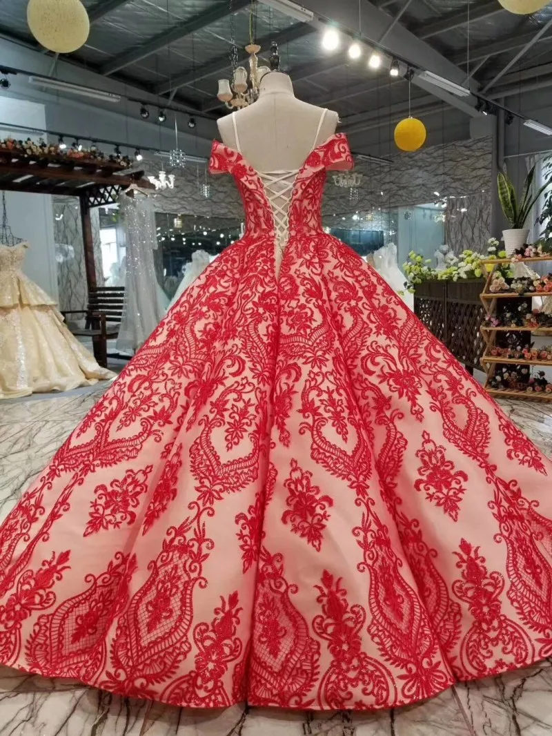 Product Name: Luxe Trouwjurken Rood Champagne Applicaties Kralen Baljurk Bruidsjurken Custom Made Lace-Up Back Sweep Trein Robe De Mariee