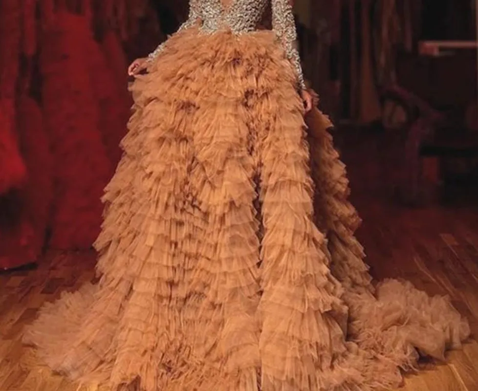 Product Name: Luxe Champagne Ruches Tulle Avondjurk Volledige Mouwen Sparkle Crystal Kralen Kant A Line Sexy Prom Jassen Vestidos De Fiesta