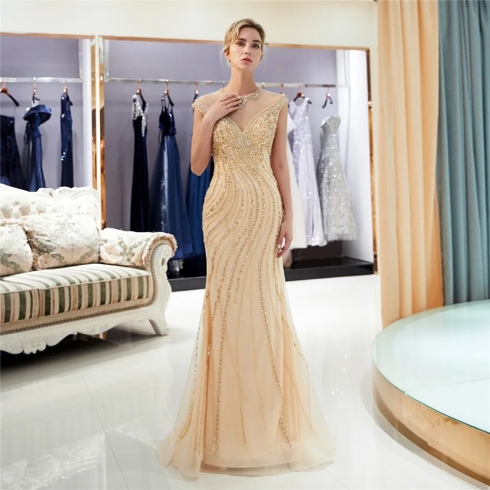 Special Offer JaneVini Luxe Prom Dress 2018 Sexy Champagne Tulle Bruidsmeisje Jurken O-hals Illusion Terug Kralen Mermaid Formele Partij Jassen Discount 49% Today!
