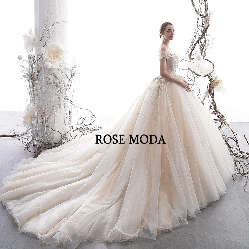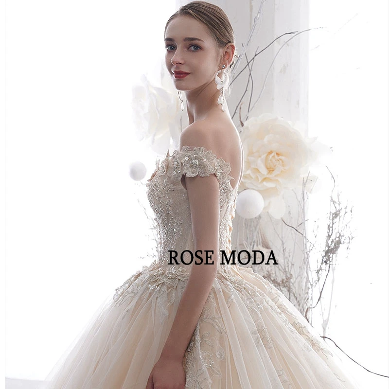 Special Offer Rose Moda Luxe Off De Schouder Ivoor En Champagne Kant Wedding Jurk Met Lange Trein Custom Maken Discount 0% Today!